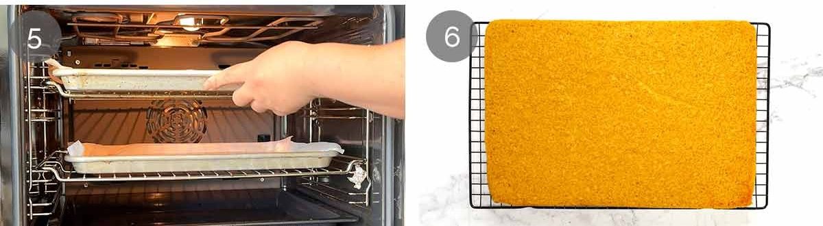 Line trays – Lightly spray or grease two trays then line with baking paper / parchment paper. I use standard jelly roll pans – 38 × 25 cm / 10 x 15″ that are 2.5 cm / 1″ deep (the cakes are 1.5cm / 0.6″ thick.