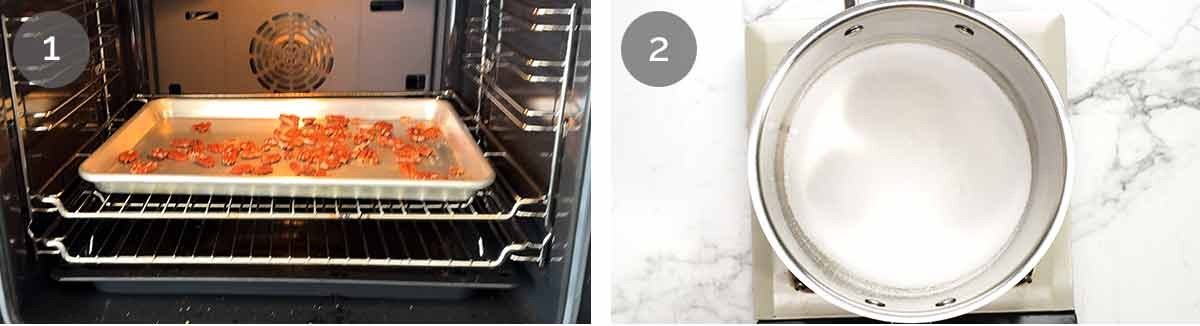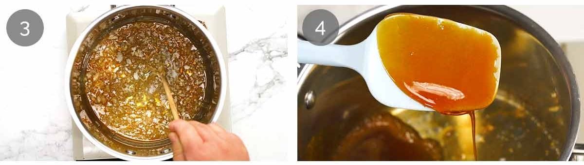 - Toffee – Spread the sugar in a large saucepan over medium low heat. Leave it until you see the edges melting into a clear sugar syrup, then use a chopstick to stir every now and then to encourage the sugar to fully melt. Once it turns pale golden, remove from heat (it will go more golden in the next step).