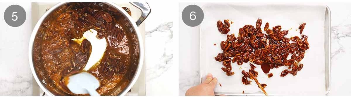Spread the pecans in a single layer on a baking paper lined tray as best you can. The toffee starts to hard quickly so it can be a battle! But don’t worry if you have pecan clumps, a thinner layer is just easier to chop than giant mounds of hard pecan toffee, and cools faster too.
