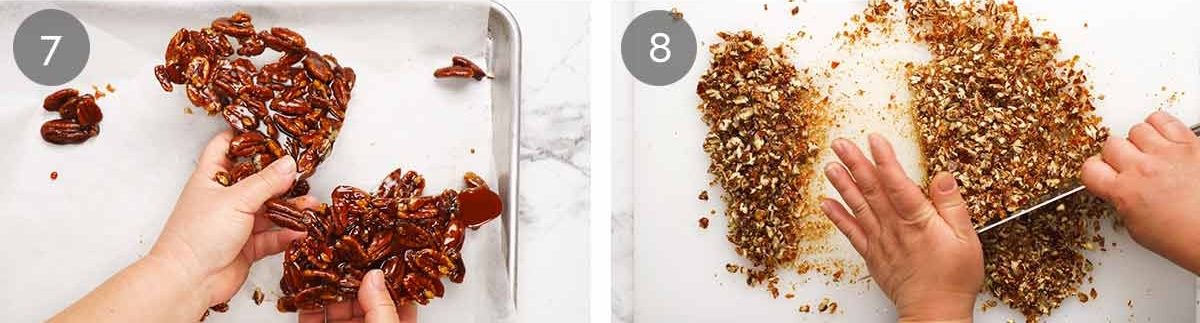 - Cool and chop – Cool for an hour until the toffee hardens. Break into large chunks then use a knife to chop it into small pieces and toffee pecan dust (this is really nice!). Set aside until required.