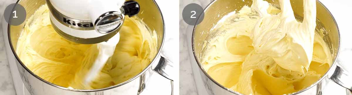 - Cream butter – Place the cream cheese and butter in a bowl. Beat for 2 minutes on medium high until smooth and fluffy. Use the paddle attachment if using a stand mixer.