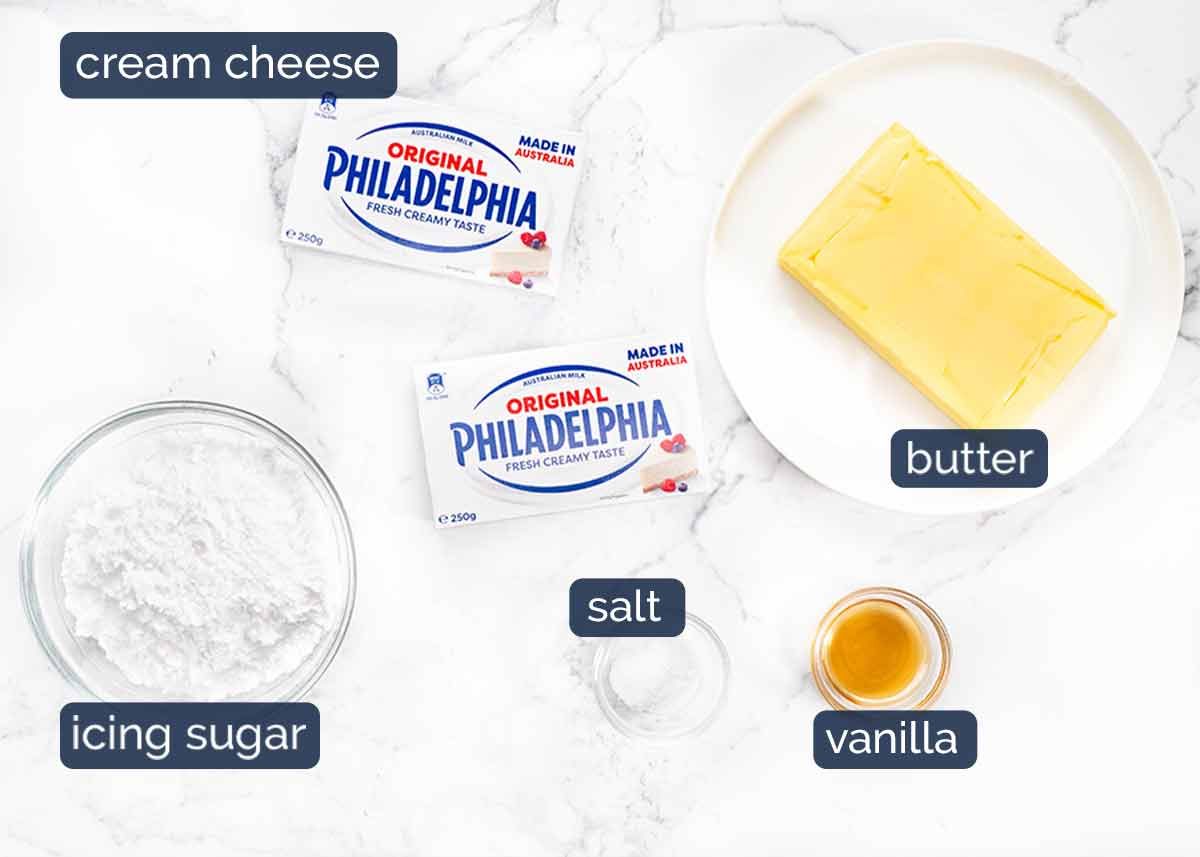 Cream cheese – Use block cream cheese, not the spreadable kind that comes in tubs (it’s too soft). If spreadable is all you can get, add a little extra icing sugar to firm up the frosting.