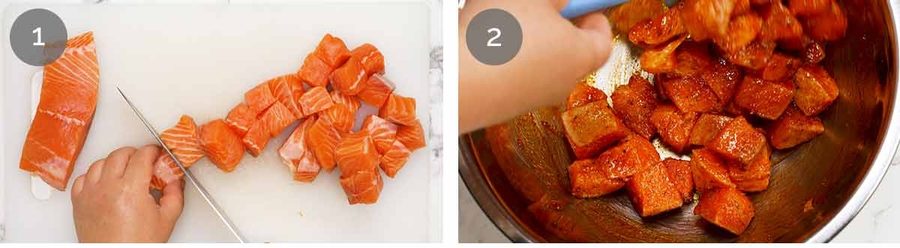 Cutting salmon into cubes means a higher ratio of tasty seasoned surface area to flesh. You won’t even need a sauce to enjoy these bites!
