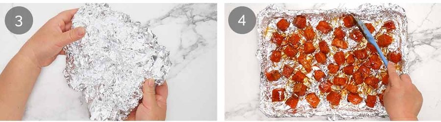 Fold the foil over the edge of the tray to hold it in place and repeat with another sheet of foil (if needed) to cover the whole tray with the wrinkly crinkly foil.