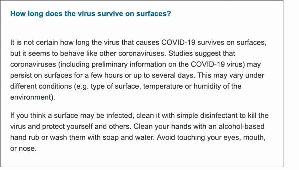 Though Coronavirus cannot be passed through food because it needs a living host to survive, it does persist on surfaces. The exact time is still unknown, but the World Health Organisation says it may be for a few hours or up to 3 days. (Excerpt here)