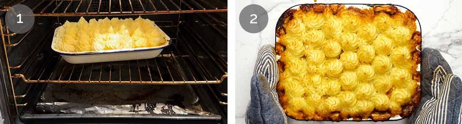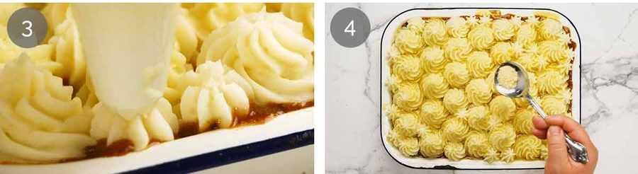 Hi Mike! It’s there under note 6 🙂 Just snip corner of ziplock bag, or use spoons to dollop tall mounds across the surface, or as you say just spread and rough up like shepherd’s pie! – N x