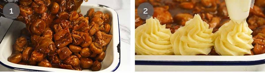 Great recipe but way too much liquid – leave out water and only add if needed – had to simmer for 25mins. Add thyme with bacon and onion. You can also use an ice cream scoop to add mash to top very effective and much faster. Thanks for a very tasty recipe.