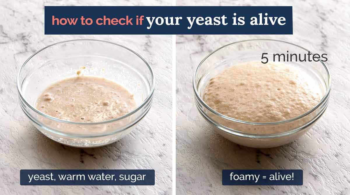 How to test your yeast is still alive – in tiny bowl, mix 2 tbsp very warm tap water with pinch of sugar and 1/4 tsp yeast. Leave in very warm place for 5 – 10 min. If surface gets foamy like the below, your yeast is alive and fine to use.
