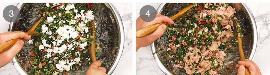 Really tasty. Lots of chopping! Note that I found that I had to add quite a lot more oil and water to make the dressing at all pourable (using Danish Fetta from Coles), which was fine to slowly add during blitzing.