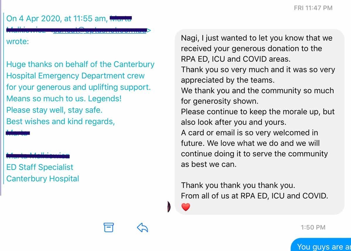 The next day, I sent 1,000 muffins to Royal Prince Alfred Hospital, Liverpool, Concord, Hornsby and Royal North Shore Hospital. Dozer shouted coffee for everyone in the Emergency Department at Canterbury Hospital, and arranged for lunch to be sent to the COVID Ward at Mona Vale Hospital.