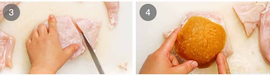 Pound to 1cm / 0.4″ thickness using a meat mallet or rollling pin.