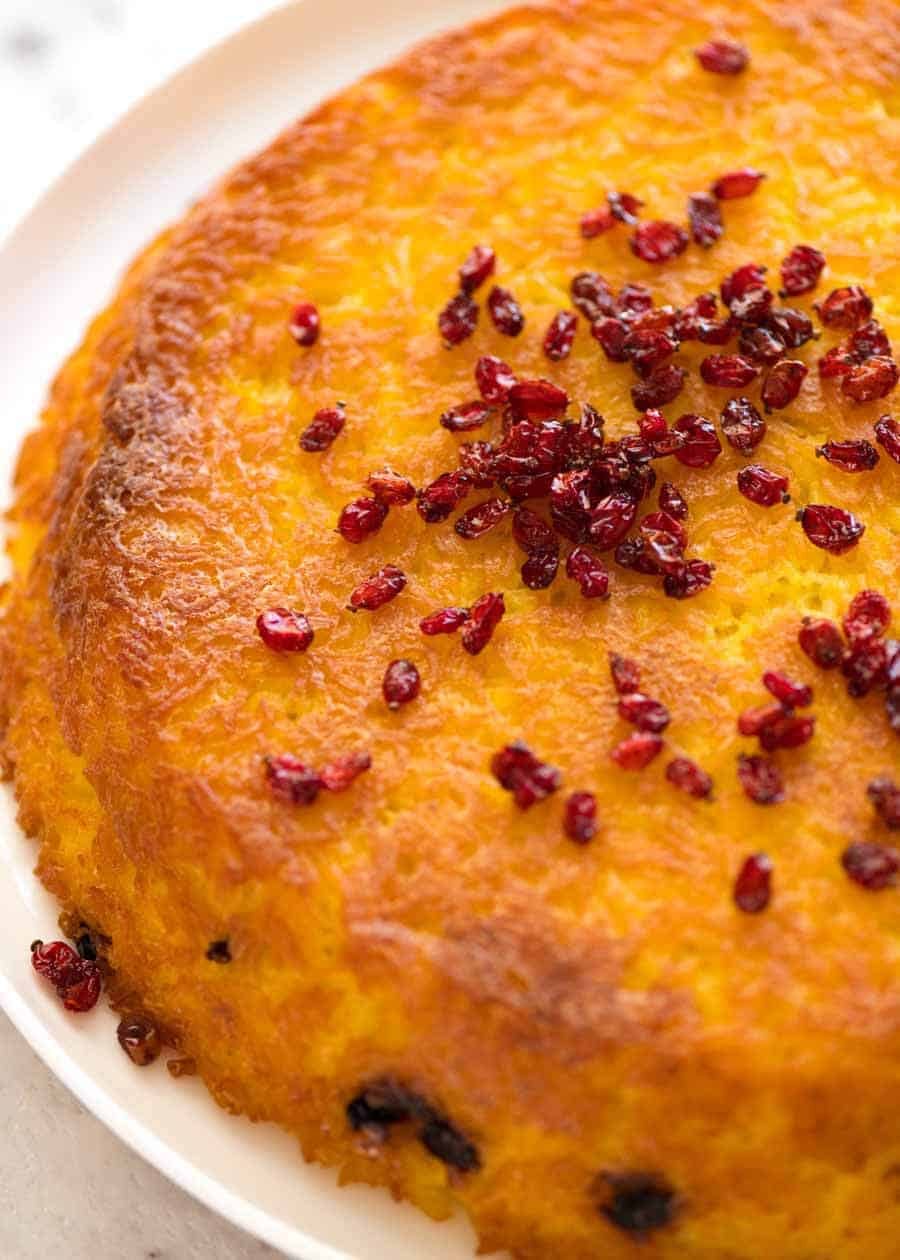 The key to this recipe is a yogurt-egg-oil-saffron mixture that is mixed with par boiled rice, then layered with barberries in a pie dish and baked until crispy on the outside.