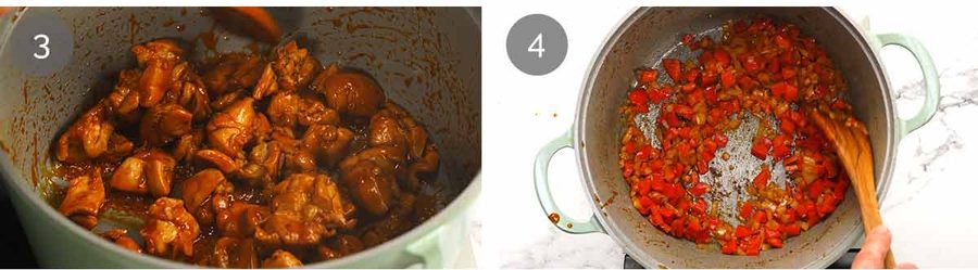 - Sear – Heat the 2 tablespoons of oil in a large heavy based pot over high heat. Add the chicken and cook until the outside is sealed and gets a bit of colour (it won't go golden). Remove with a slotted spoon into a bowl, leaving oil behind in the pot.