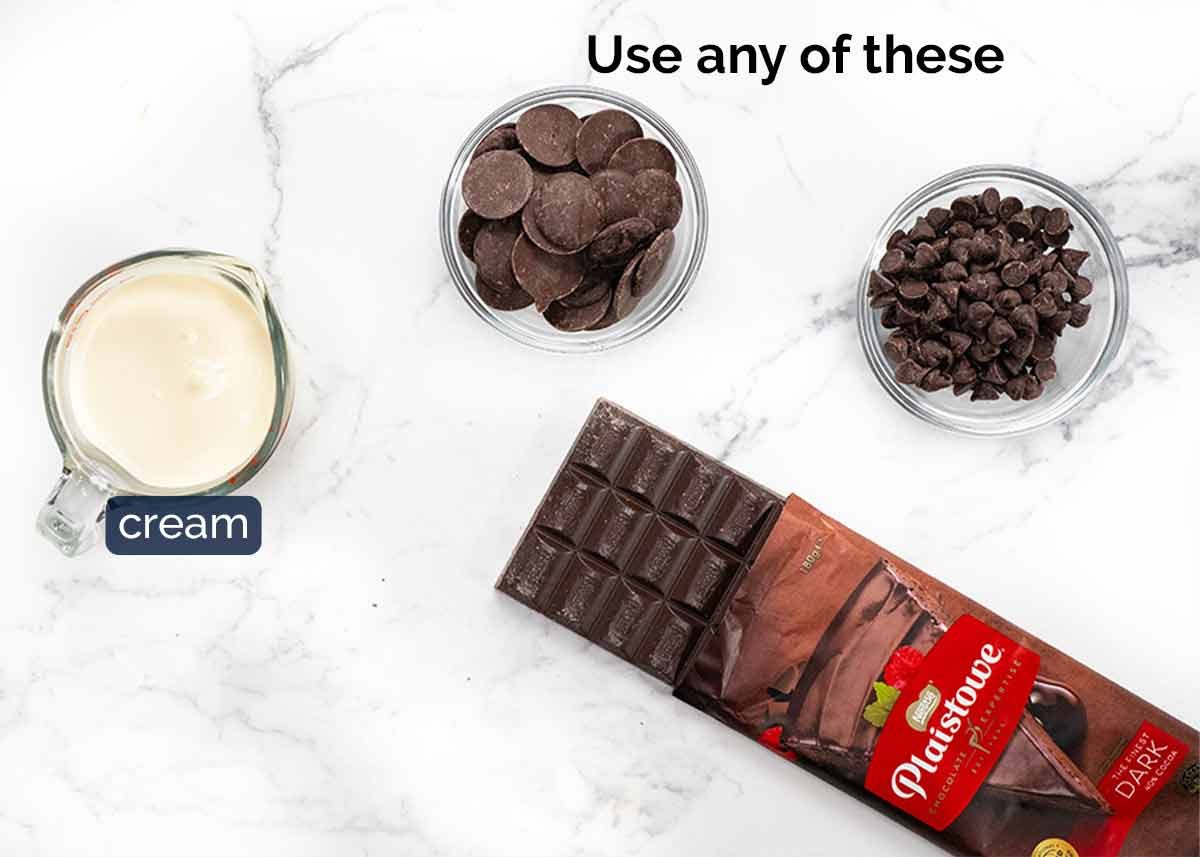 - 180g / 6 oz dark chocolate / semi-sweet chocolate melts or chips , or chopped dark chocolate – (Note 3 for other chocolate)